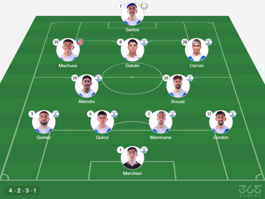 - Provável escalação do Racing: Cambeses; Pardo, Sosa e Colombo; Mura, Nardoni, Almendra e Rojas; Martirena, Vergara e Adrian Martínez.