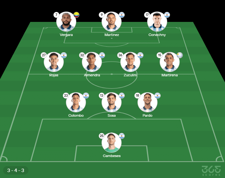 - Provável escalação do Racing: Cambeses, Colombo, Sosa e Pardo; Rojas, Almendra, Cuzulini e Martirena; Vergara, Conechny e Adrián Martínez