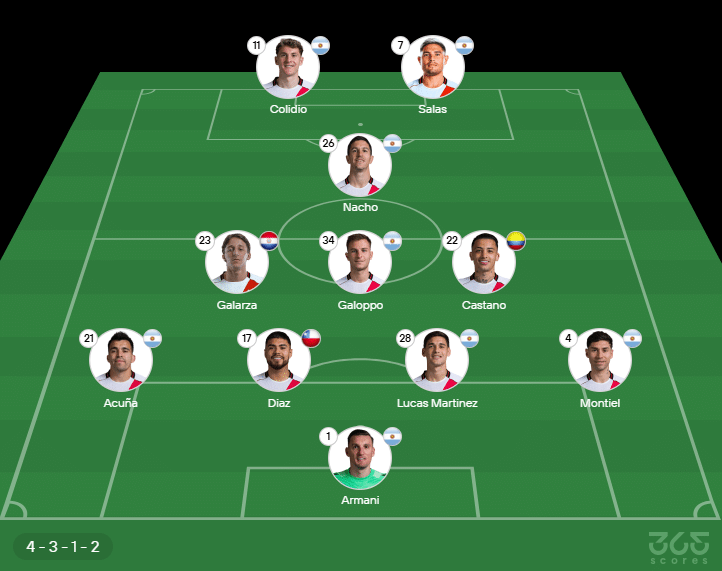 - Provável escalação do River Plate: Armani, Acuña, Paulo Diaz, Lucas Martínez e Montiel; Galarza, Galoppo, Castano e Nacho; Colidio e Salas