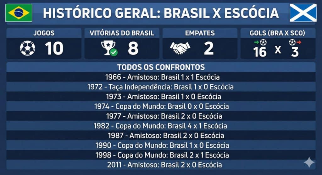 Brasil e Escócia já se enfrentaram dez vezes na história do confronto sem nenhuma derrota brasileira. Em Copa do Mundo, o duelo aconteceu em quatro oportunidades, todas elas pela fase de grupos.