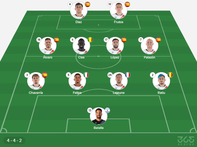 Provável escalação do Rayo Vallecano: Batalla, Ratiu, Lejeune, Luiz Felipe, Chavarría; López, Ciss, Palazón, Álvaro; De Frutos, Diaz. Técnico: Iñigo Pérez