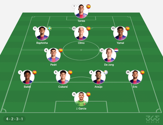 Provável escalação do Barcelona: Joan García, Eric García, Araújo, Cubarsí, Baldé; De Jong, Pedri, Yamal, Raphinha, Dani Olmo; Torres. Técnico: Hans-Dieter Flick