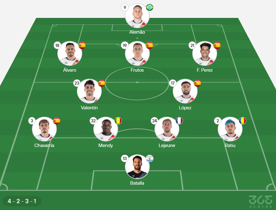 Provável escalação do Rayo Vallecano: Batalla; Ratiu, Lejeune, Mendy e Chavarría; López e Valentín; Frutos, F. Perez e Álvaro; Alemão.