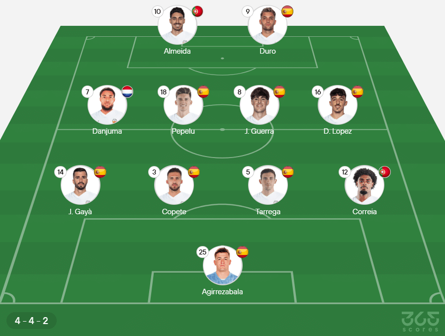 Técnico: Iñigo Pérez. - Provável escalação do Valencia: Agirrezabala; Correia, Tarrega, Copete e J. Gayà; D. López, J. Guerra, Pepelu e Danjuma; André Almeida e Hugo Duro.