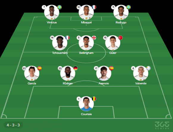 - Escalação do Real Madrid: Courtois; Valverde, Asencio, Rüdiger, Fran García; Bellingham, Güler, Tchouaméni; Rodrygo, Vinicius Júnior, Mbappé