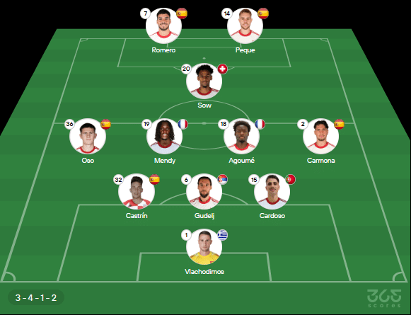 Provável escalação do Sevilla: Vlachodimos; Cardoso, Gudelj, Castrín; Carmona, Agoumé, Mendy, Oso, Sow; Peque, Romero. Técnico: Matias Almeyda