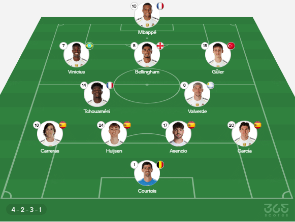 Provável escalação do Real Madrid: Courtois, García, Asencio, Huijsen, Carreras; Valverde, Tchouaméni, Güler, Vinicius Júnior, Bellingham; Mbappé. Técnico: Xabi Alonso