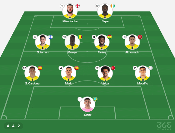 - Provável escalação do Villarreal: Luiz Júnior, Mouriño, Veiga, Marín, Cardona; Partey, Guete, Akhomach, Solomon; Pepe, MIkautdze