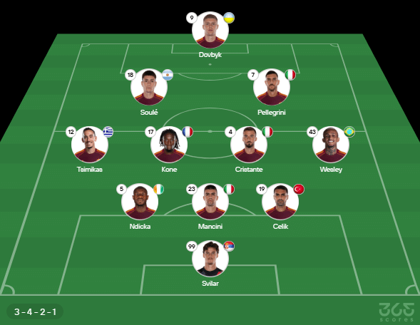 Provável escalação da Roma: Svilar; Ndicka, Mancini e Celik; Tsimikas, Kone, Cristante e Wesley; Soulé e Pellegrini; Dovbyk. Técnico: Gian Piero Gasperini.