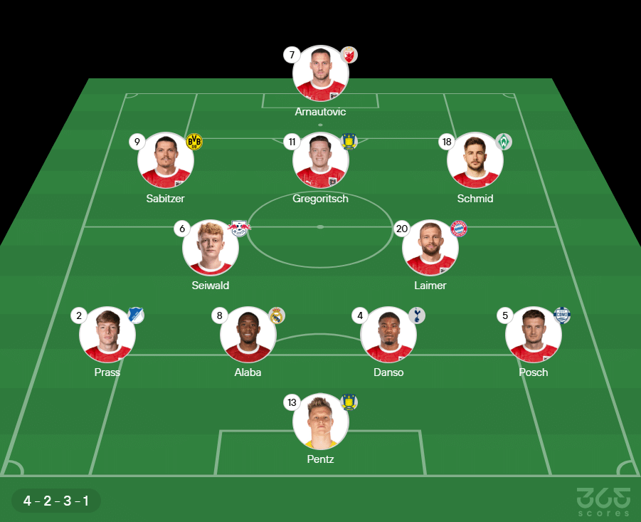 Provável escalação da Áustria: Pentz, Prass, Alaba, Danso e Posch; Seiwald, Laimer, Sabitzer, Gregoritsch e Schmid; Arnautovic. Técnico: Ralf Rangnick.