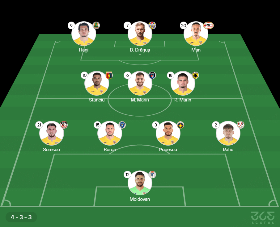 - Provável escalação da Romênia: Moldovan, Sorescu, Burca, Popescu e Ratiu; Stanciu, Marius Marin e Razvan Marin. Hagi, Dragus e Man