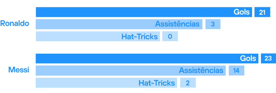 | Competição | Partidas jogadas | Vitórias CR7 | Vitórias Messi | Empates |