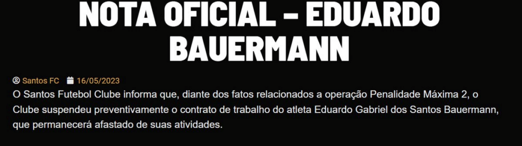 “O Santos Futebol Clube informa que, diante dos fatos relacionados a operação Penalidade Máxima 2, o Clube suspendeu preventivamente o contrato de trabalho do atleta Eduardo Gabriel dos Santos Bauermann, que permanecerá afastado de suas atividades”, afirmou o clube em nota.