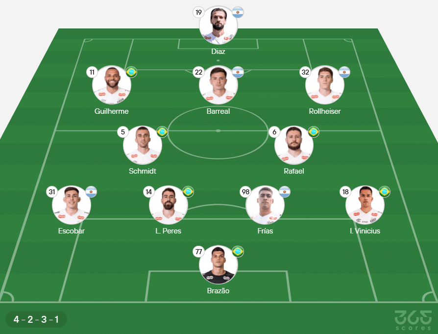 - Provável escalação do Santos: Brazão; Igor Vinícius, Adonis Frías, Luan Peres e Escobar; João Schmidt e Zé Rafael; Barreal, Rollheiser e Guilherme; Lautaro Díaz.