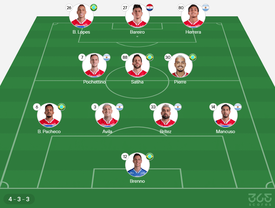 Provável escalação do Fortaleza: Brenno; Mancuso, Brítez, Avila e Bruno Pacheco. Lucas Sasha, Pochettino e Pierre; Herrera, Breno Lopes e Bareiro.
