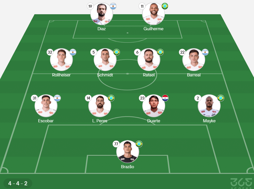 - Provável escalação do Santos: Brazão, Mayke, Alexis Duarte, Luan Peres e Escobar; João Schmidt, Zé Rafael, Barreal e Rollheiser; Guilherme e Lautaro Díaz.