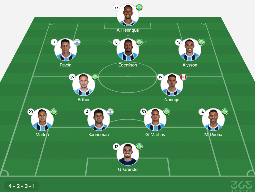 Provável escalação do Grêmio: Gabriel Grando; Marcos Rocha, Gustavo Martins, Kannemann e Marlon; Noriega e Arthur Melo; Edenilson, Alysson e Pavón; André Henrique.