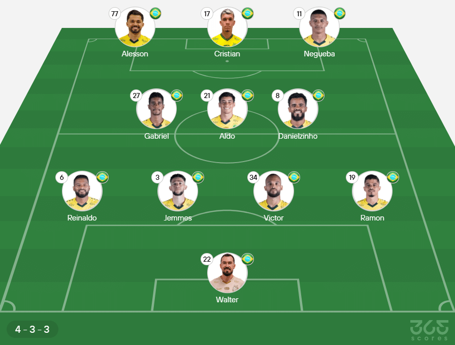 Provável escalação do Mirassol: Walter; Ramon, Victor, Jemmes e Reinaldo; José Aldo, Gabriel e Danielzinho; Alesson, Negueba e Cristian.