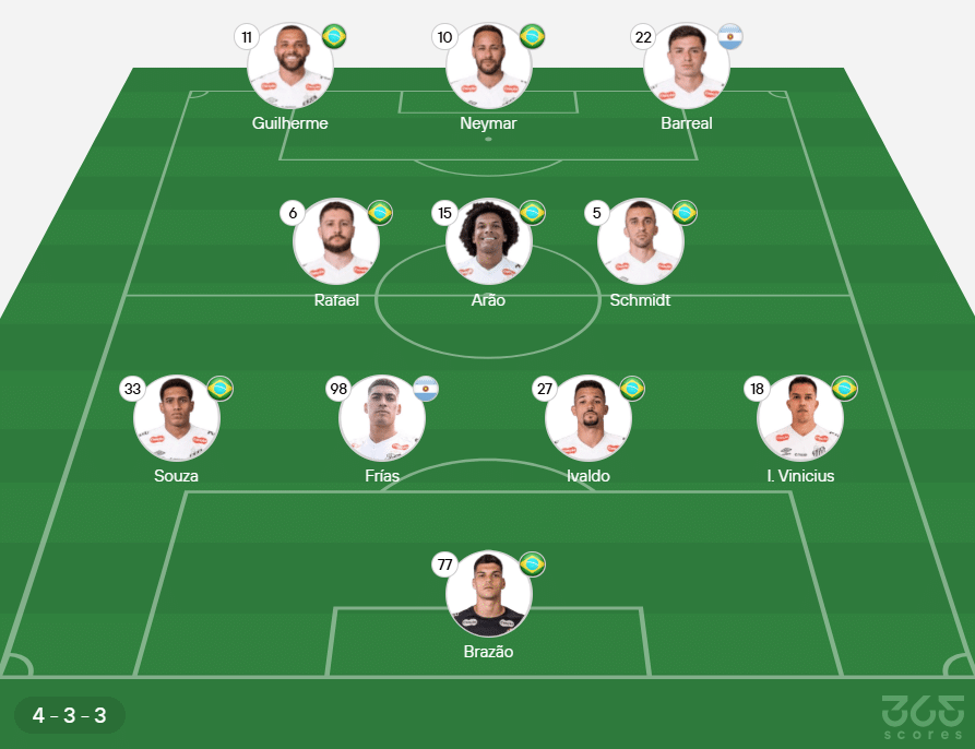 - Provável escalação do Santos: Brazão; Igor Vinícius, Zé Ivaldo, Adonis Frías e Souza; João Schmidt, Willian Arão e Zé Rafael; Barreal, Guilherme e Neymar.