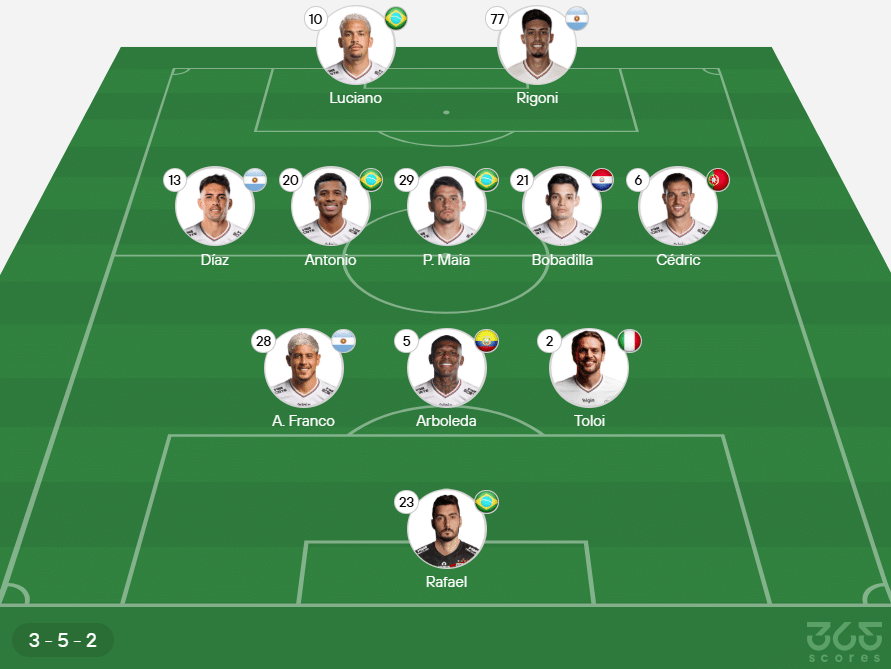Provável escalação do São Paulo: Rafael; Rafael Toloi; Arboleda e Alan Franco; Cedric, Bobadilla, Pablo Maia, Marcos Antônio e Enzo Díaz; Rigoni e Luciano.