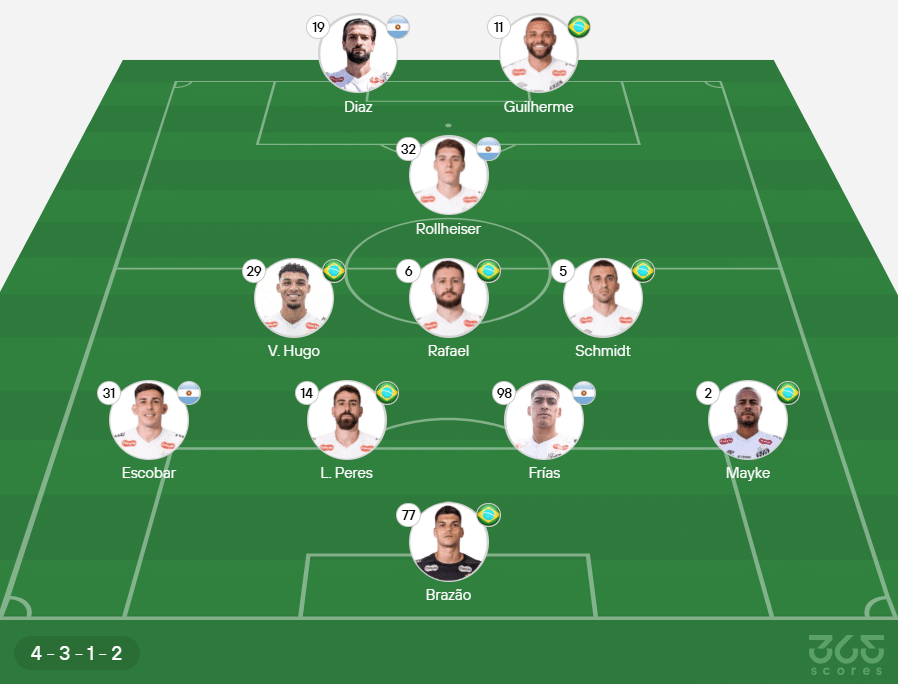 Provável escalação do Santos: Diógenes (Brazão), Mayke, Adonis Frías, Luan Peres e Escobar; João Schmidt, Zé Rafael e Victor Hugo; Rollheiser; Guilherme e Lautaro Díaz.