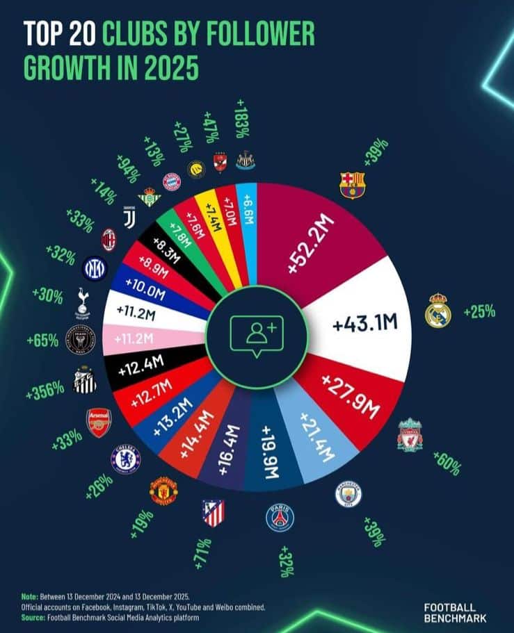 Com um salto impressionante de 356% em sua base de fãs, o clube adicionou 12,4 milhões de novos seguidores, garantindo a 10ª posição no ranking global de crescimento.
