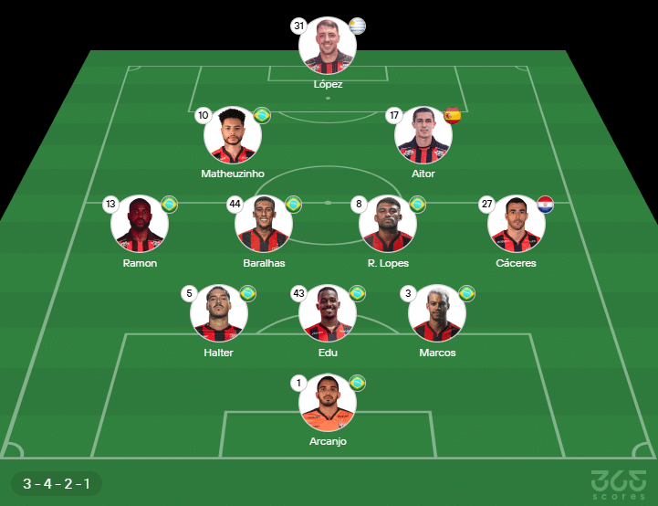 - Provável escalação do Vitória: Lucas Arcanjo; Lucas Halter, Edu e Zé Marcos; Ramon, Baralhas, Ronald Lopes e Cáceres; Matheuzinho e Aitor; López