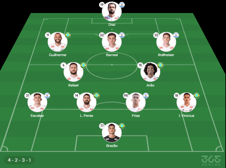 - Provável escalação do Santos: Gabriel Brazão; Escobar, Luan Peres, Frías e Igor Vinícius; Zé Rafael e Willian Arão; Guilherme, Barreal e Rollheiser; Lautaro Díaz
