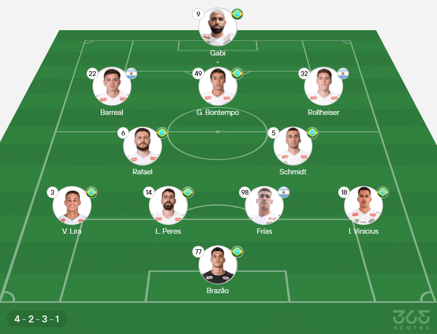 Santos: Brazão; Igor Vinícius, Adonis Frías, Luan Peres e Vinícius Lira; João Schmidt e Zé Rafael; Gabriel Bontempo (Miguelito), Rollheiser e Barreal; Gabigol.
