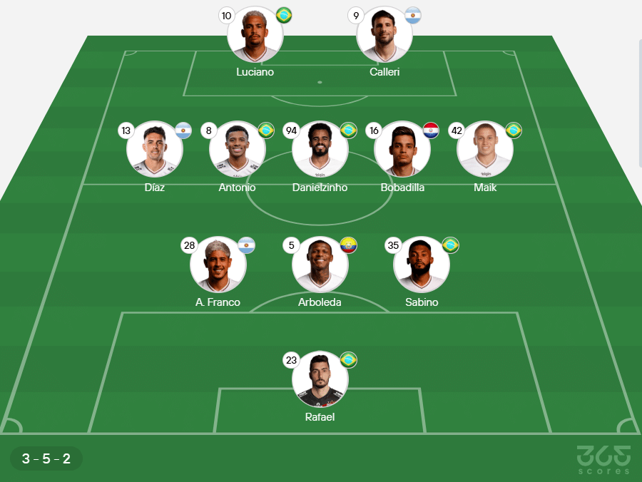 São Paulo: Rafael; Sabino, Arboleda e Alan Franco; Maik, Bobadilla, Danielzinho, Marcos Antônio e Enzo Díaz; Luciano e Calleri (Tapia).