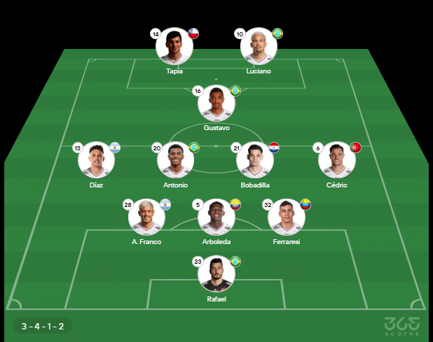 - Provável escalação do São Paulo: Rafael; Ferraresi, Arboleda, Alan Franco; Cédric, Bobadilla, Antonio, Díaz, Gustavo; Luciano, Tapia