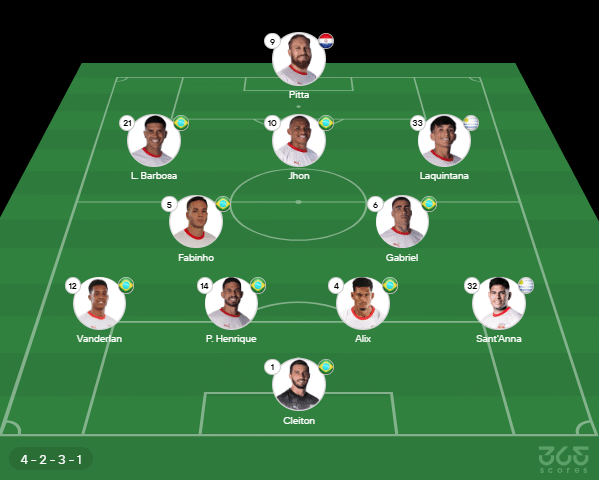 - Provável escalação do Bragantino: Cleiton; Sant’Anna, Alix, P. Henrique, Vanderlan; Gabriel, Fabinho, Jhon Jhon; Laquintana, Lucas Barbosa, Pitta