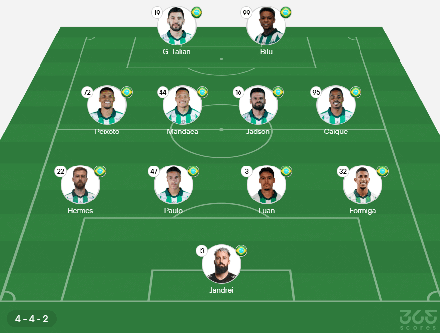 Provável escalação do Juventude: Jandrei; Formiga, Luan, Paulo e Hermes; Caique, Jadson, Mandaca e Peixoto; Bilu e Gabriel Talliari.