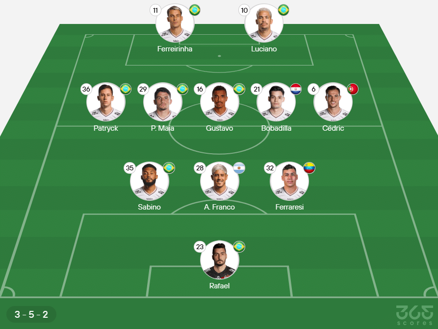 - Provável escalação do São Paulo: Rafael, Ferraresi, Alan Franco e Sabino; Cedric Soares, Bobadilla, Luiz Gustavo, Pablo Maia e Patryck; Ferreirinha e Luciano.