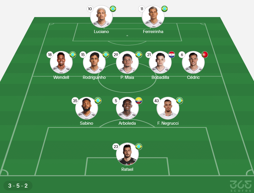- Provável escalação do São Paulo: Rafael; Sabino, Arboleda e Negrucci; Cédric Soares, Bobadilla, Pablo Maia, Rodriguinho e Wendell; Ferreirinha e Luciano.