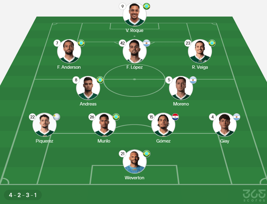 Provável escalação do Palmeiras: Weverton; Giay, Gustavo Gómez, Murilo e Piquerez; Aníbal Moreno e Andreas Pereira; Raphael Veiga, Felipe Anderson e Flaco López; Vítor Roque.