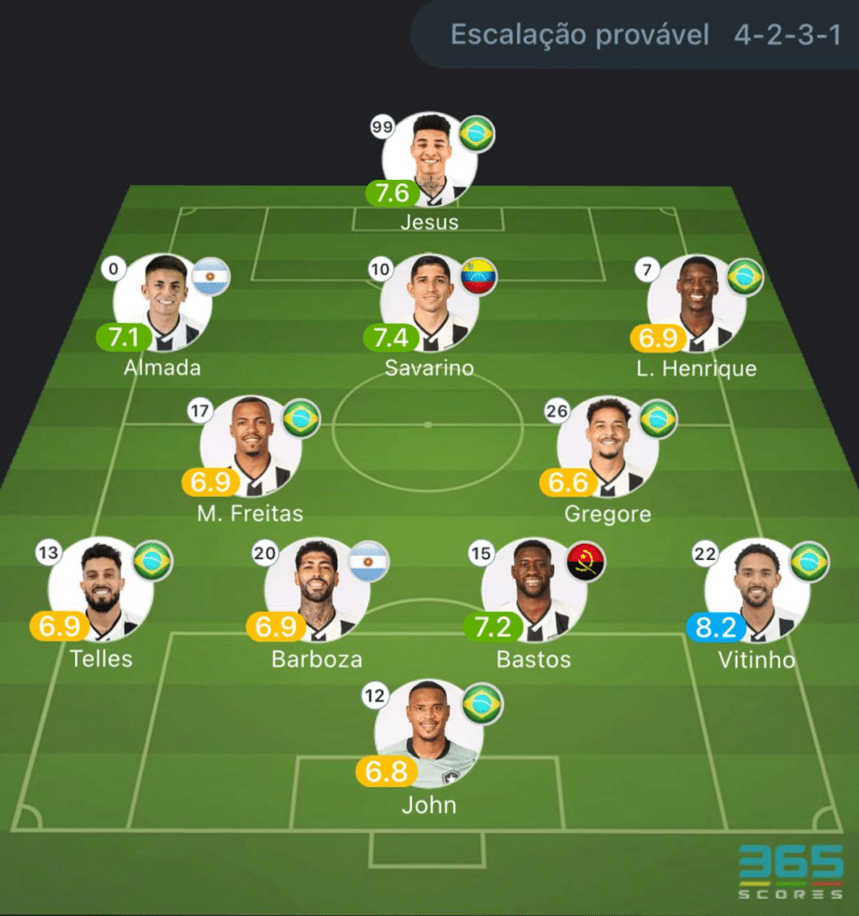 Provável escalação do Botafogo: John, Vitinho, Bastos, Alexander Barboza e Alex Telles; Gregore e Marlon Freitas; Luiz Henrique, Savarino e Thiago Almada; Igor Jesus. Técnico: Artur Jorge