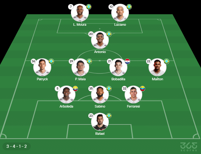 - Provável escalação do São Paulo: Rafael; Ferraresi, Sabino e Arboleda; Maílton, Bobadilla, Pablo Maia, Patryck e Marcos Antônio; Luciano e Lucas Moura