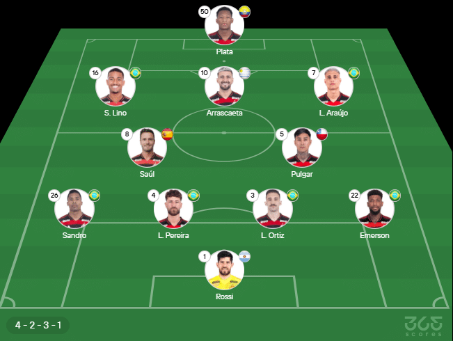 - Provável escalação do Flamengo: Rossi; Emerson Royal, Léo Ortiz, Léo Pereira e Alex Sandro; Pulgar e Saúl; Luiz Araújo, Arrascaeta e Samuel Lino; Gonzalo Plata