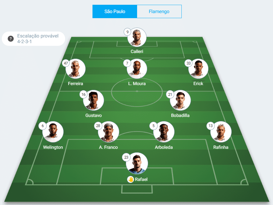 - Escalação do São Paulo: Rafael; Rafinha, Arboleda, Alan Franco e Welington; Luiz Gustavo e Bobadilla; Lucas, Erick (Wellington Rato) e Ferreira; Calleri