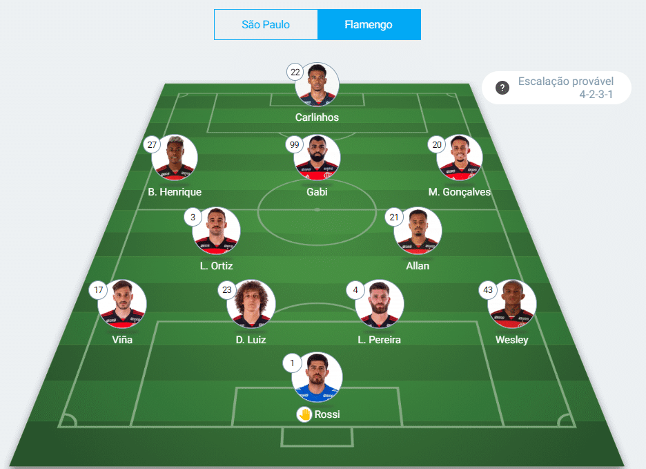 - Escalacão do Flamengo: Rossi, Wesley, David Luiz, Léo Pereira e Viña; Léo Ortiz, Allan e Gabigol; Matheus Gonçalves, Bruno Henrique e Carlinhos.
