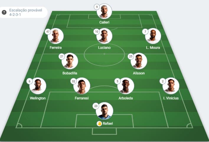 Provável escalação do São Paulo: Rafael, Igor Vinicius, Arboleda, Ferraresi e Welington; Alisson e Bobadilla; Lucas Moura, Luciano e Ferreirinha; Calleri.