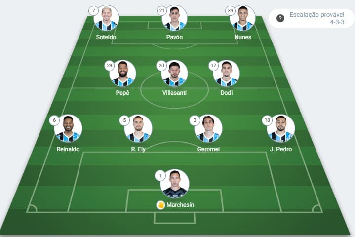 Provável escalação do Grêmio: Marchesín, João Pedro, Geromel, Ely e Reinaldo; Dodi, Villasanti e Pepê; Soteldo, Pavón e Nunes.