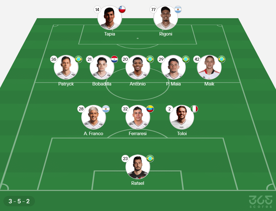 Para o duelo, o técnico Hernán Crespo terá os retornos do goleiro Rafael e do zagueiro Sabino, que cumpriram suspensão na rodada anterior. Além deles, os atacantes Luciano e Ferreirinha treinaram no último domingo (30) e devem ficar à disposição.