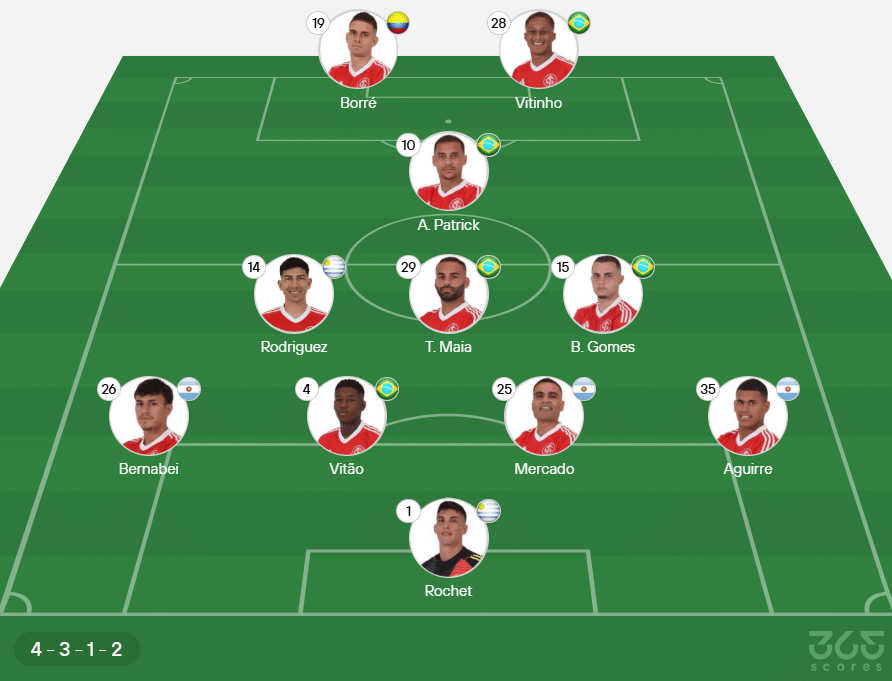 Escalação do Internacional: Rochet; Aguirre, Mercado, Vitão e Bernabei; Thiago Maia, Bruno Gomes e Alan Rodríguez; Alan Patrick; Vitinho e Borré.