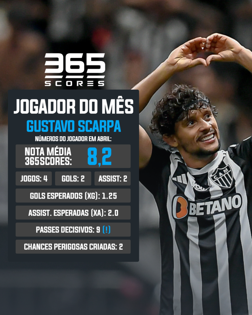 Com base nas estatísticas do aplicativo, Gustavo Scarpa, do Atlético-MG, foi eleito o Jogador do Mês 365Scores em abril. Pelo Brasileirão, o meio-campista participou de quatro partidas, com dois gols, duas assistências e nove passes decisivos.