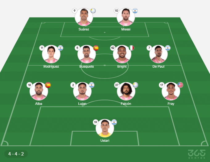 - Provável escalação do Inter Miami: Ustari, Fray, Falcón, Lujan, Alba; Busquets, Bright, De Paul, Rodríguez; Messi, Suárez