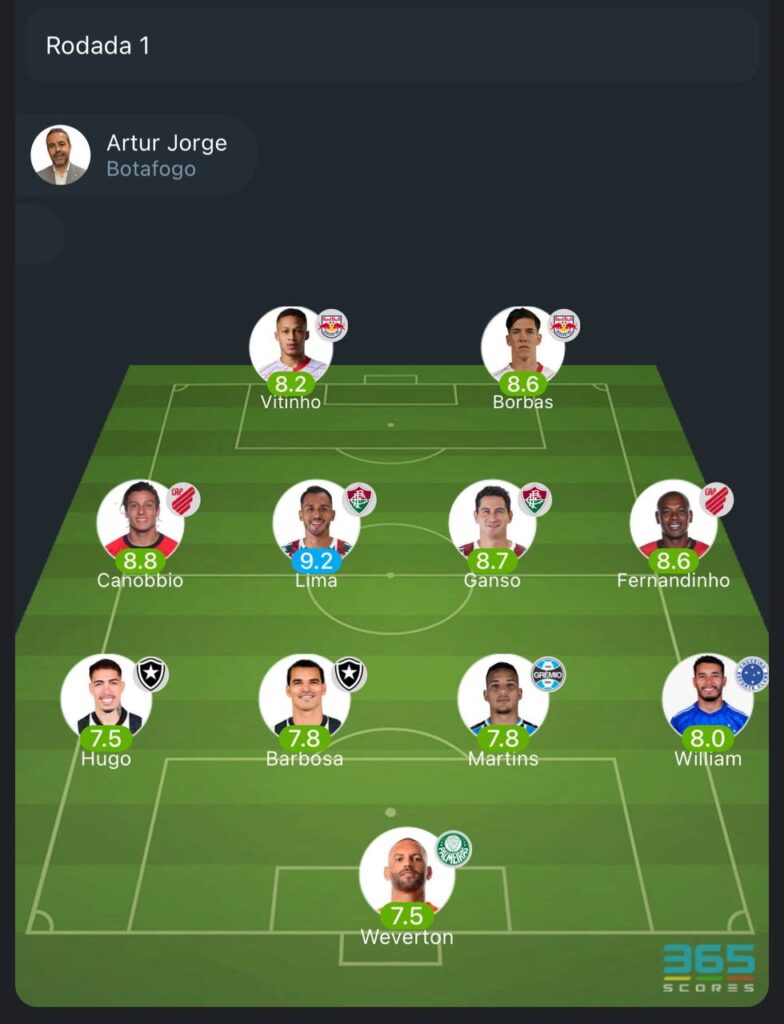Seleção 365Scores da 1ª rodada do Brasileirão: Weverton; Hugo, Danilo Barbosa, Gustavo Martins e William; Canobbio, Lima, Ganso e Fernandinho; Vitinho e Borbas; Artur Jorge.