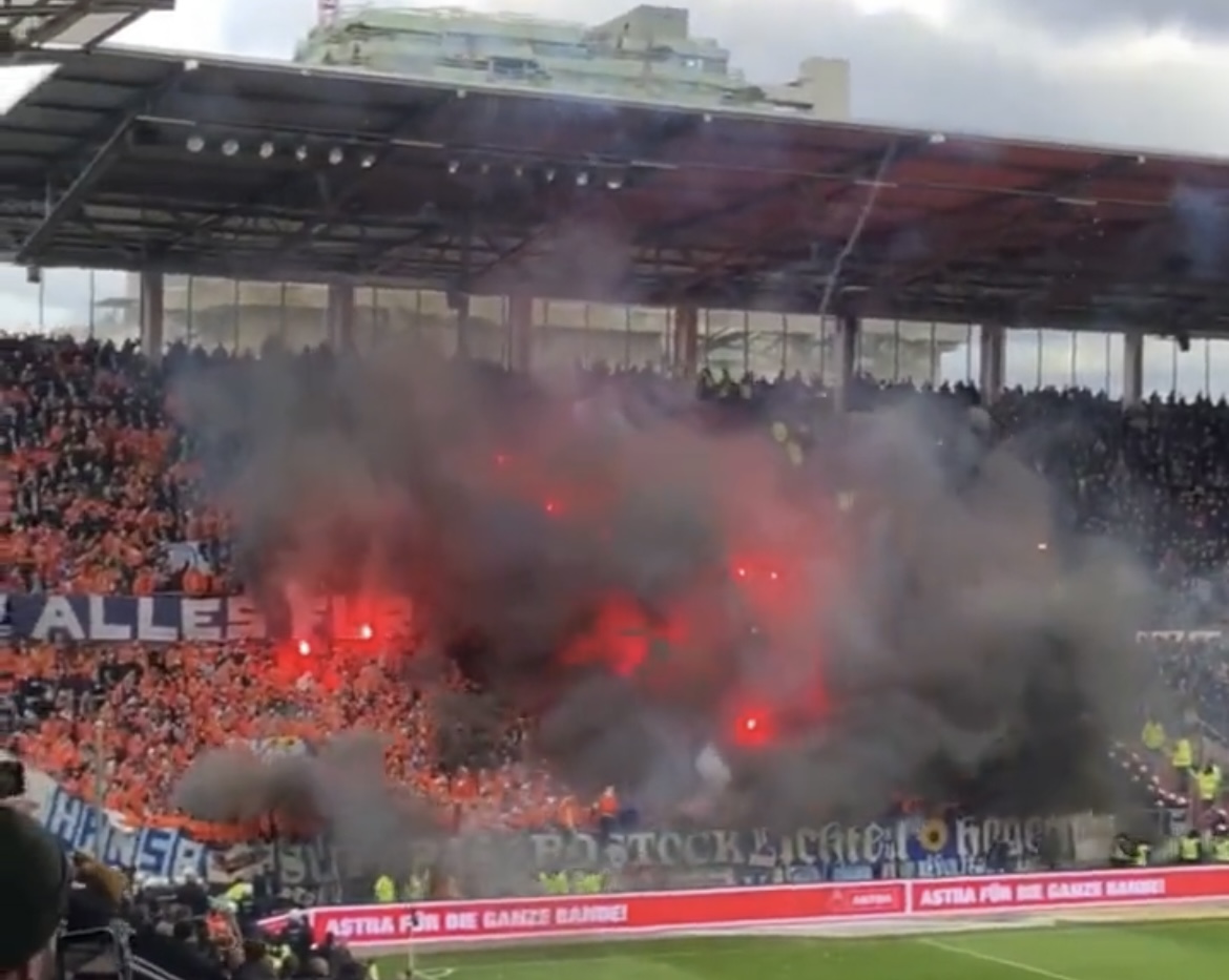 A partida deste domingo (26) entre St. Pauli e Hansa Rostock, pela 22ª rodada da segunda divisão da Alemanha, ficou marcada por imagens impactantes. O uso de pirotecnia provocou incêndio na arquibancada e deixou torcedores feridos.