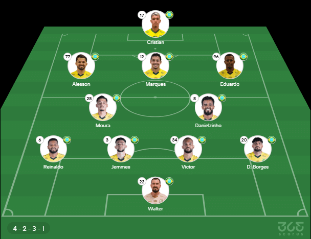 - Provável escalação do Mirassol: Walter; D. Borges, Victor, Jemmes, Reinaldo; Danielzinho, Moura, Marques; Eduardo, Alesson, Cristian